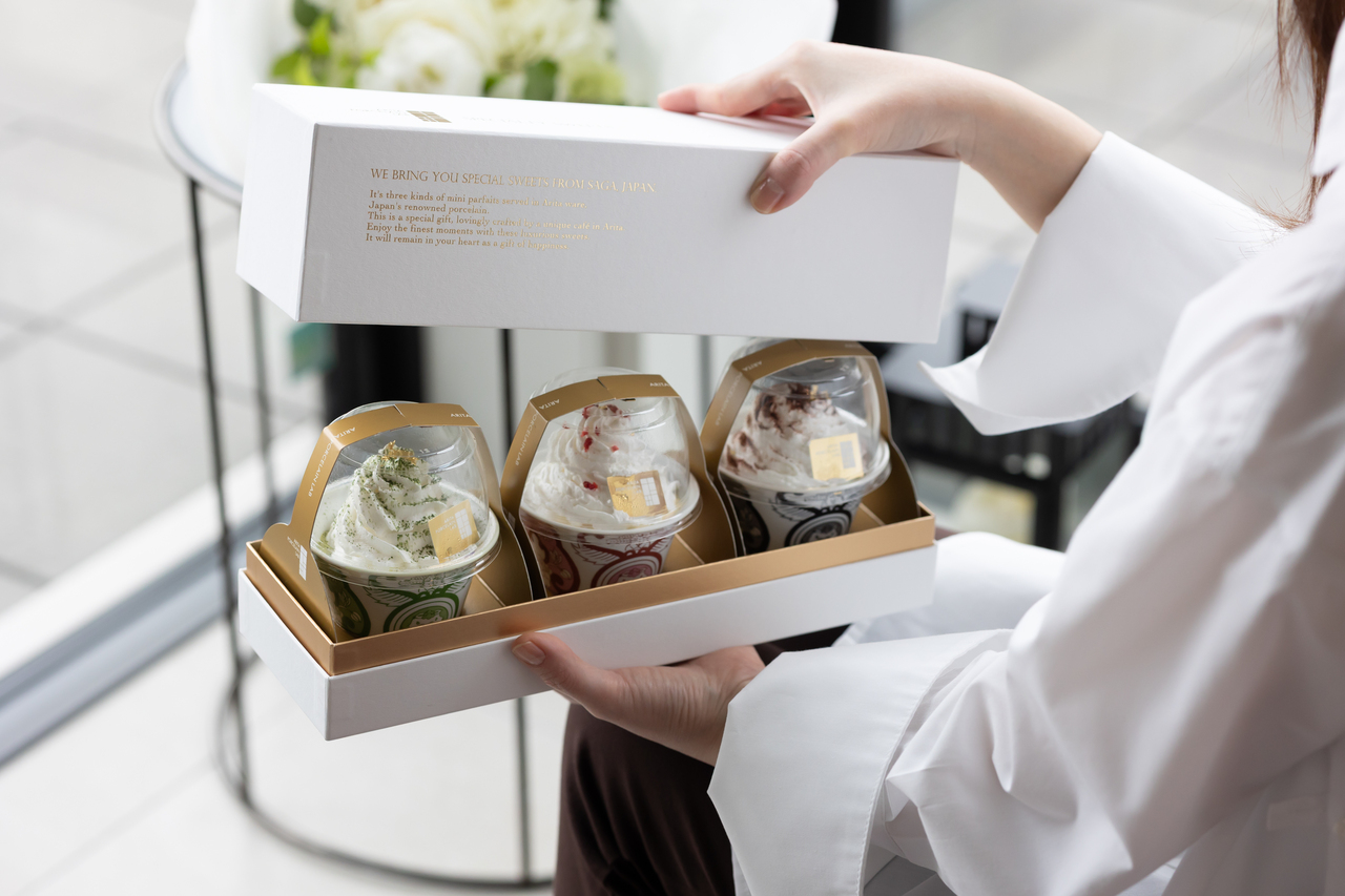有田焼付きのパフェの3種類セット。食べた後は器として使えてギフトでも大人気です。おもてなしセレクション2024年度金賞を受賞しました。母の日、父の日、敬老の日、バレンタインデー、ホワイトデーなど特別な人に特別なものを送りたい時におすすめです。